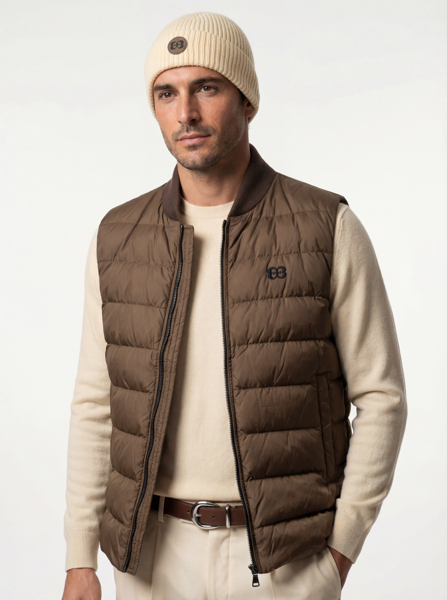 Σχεδιασμένο στο atelier Elio Evan, αυτό το υβριδικό ανδρικό γιλέκο συνδυάζει τεχνική προστασία και διακριτική κομψότητα.