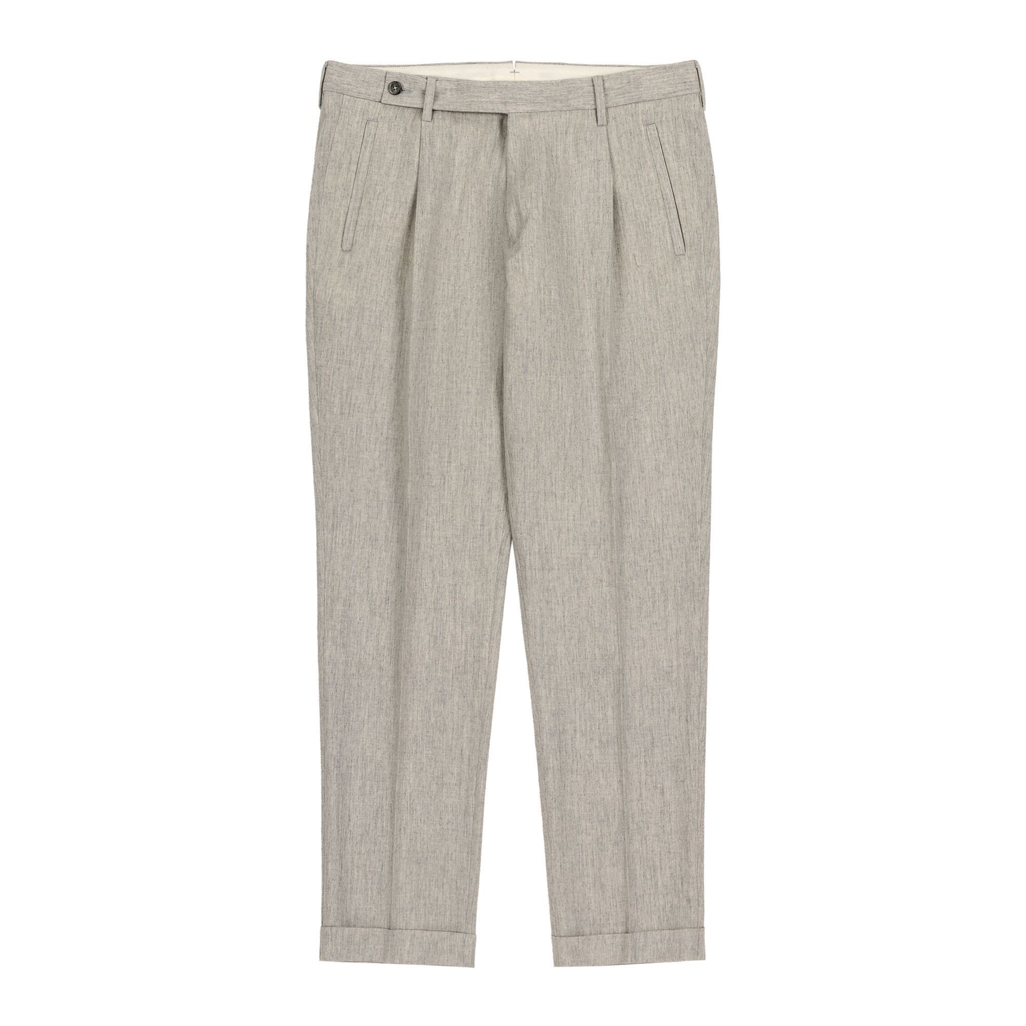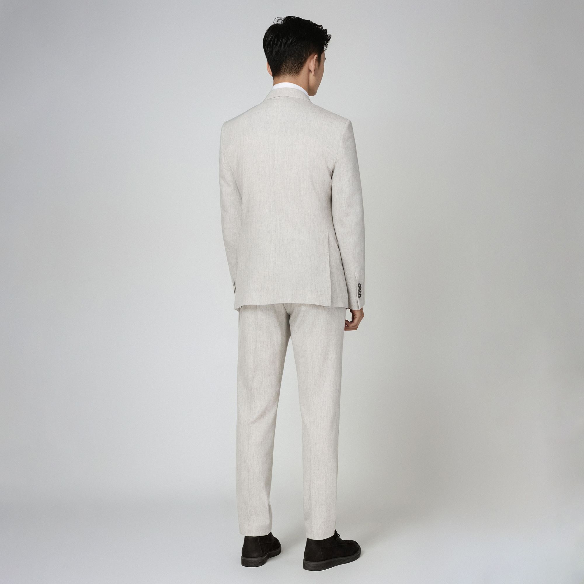 Το παντελόνι, με μονή πιέτα και ρεβέρ, ολοκληρώνει ένα μοντέρνο ανδρικό κοστούμι που ισορροπεί ανάμεσα στην παράδοση και τη σύγχρονη αισθητική.