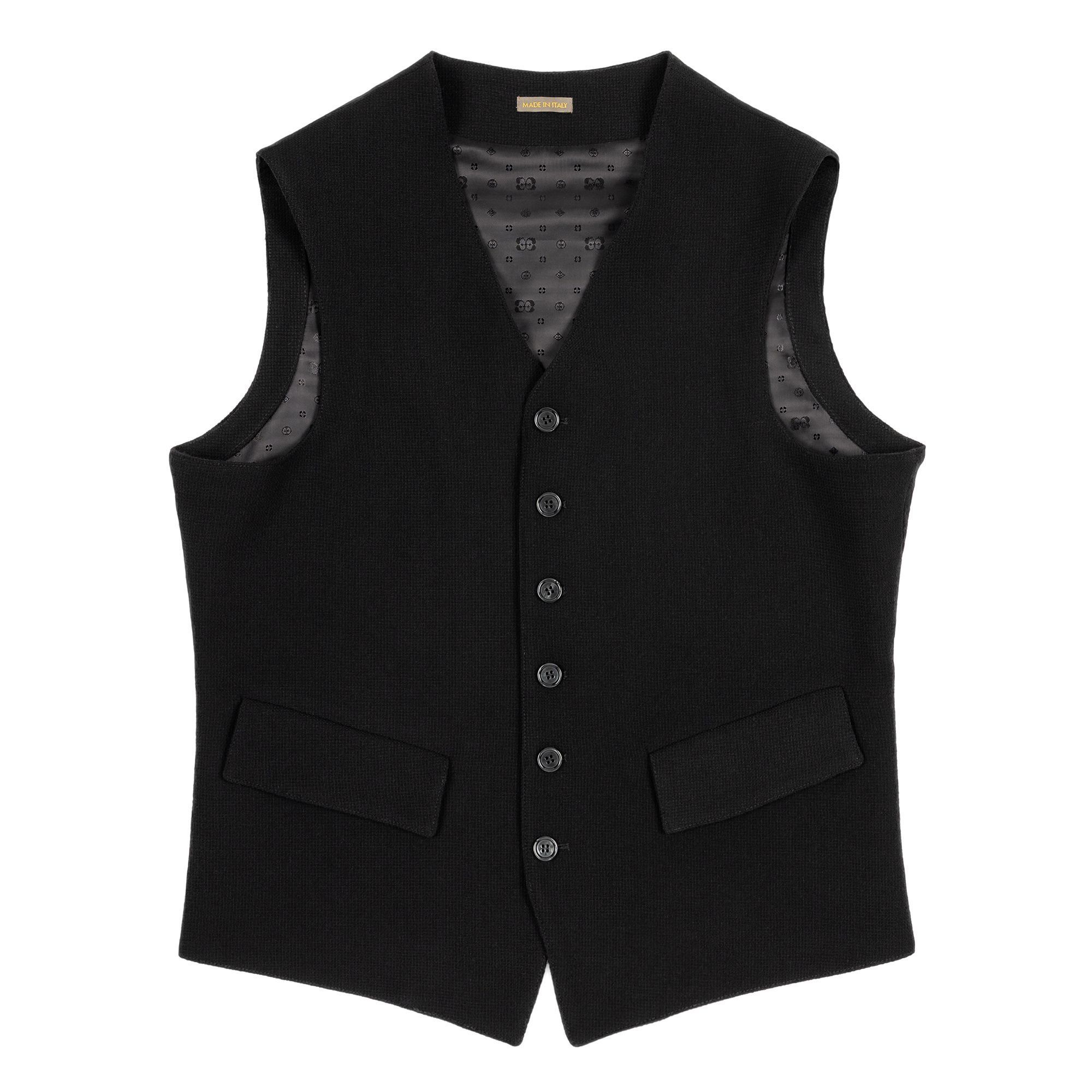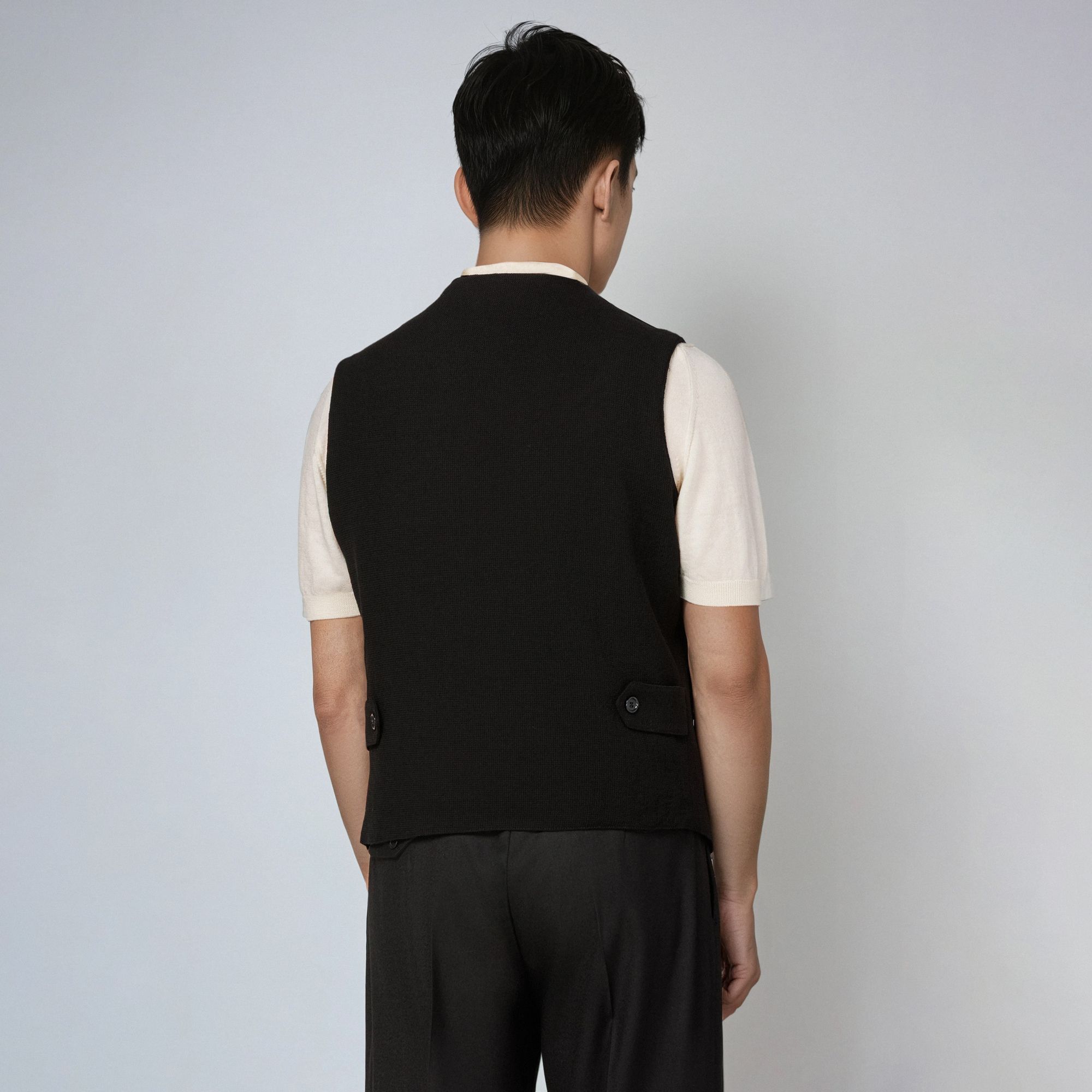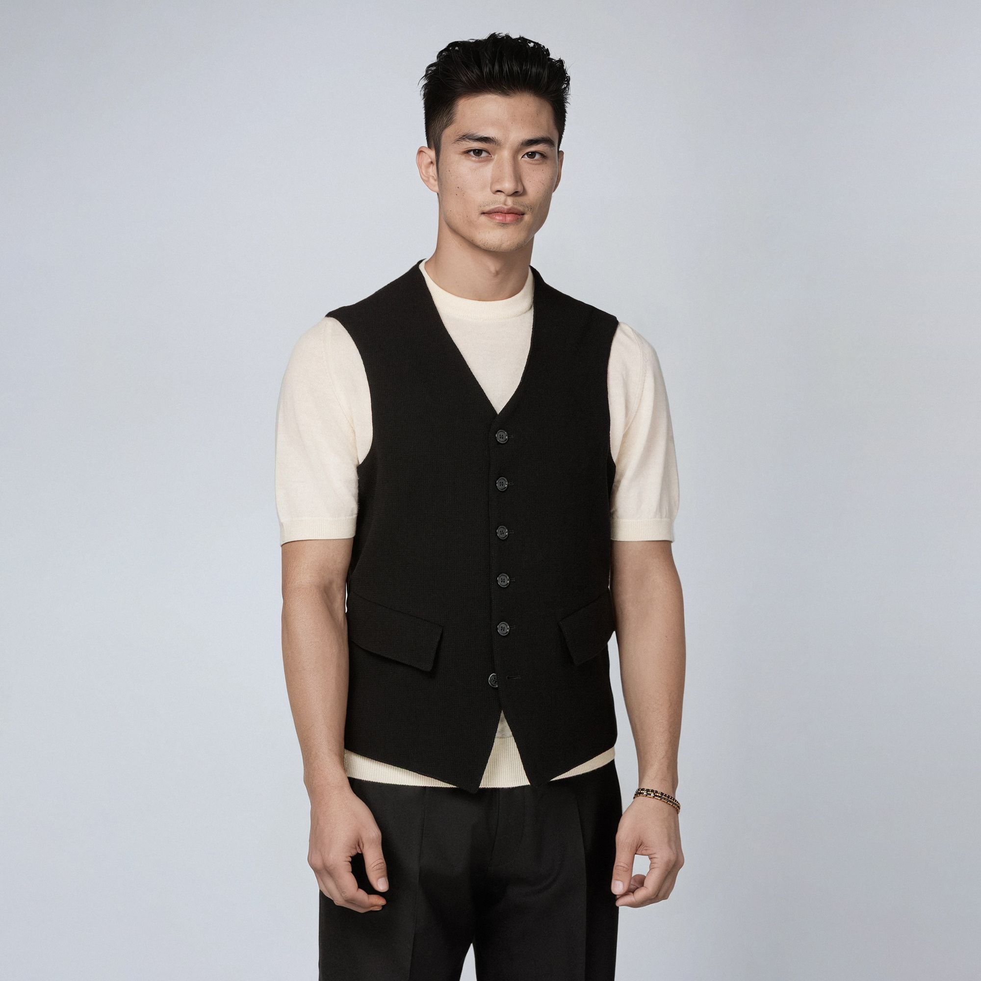 Ένα ανδρικό μαύρο γιλέκο από πλεκτό μάλλινο ύφασμα με φυσική ελαστικότητα και μαλακή υφή, που εξασφαλίζει κομψότητα και άνεση καθ’ όλη τη διάρκεια της ημέρας.