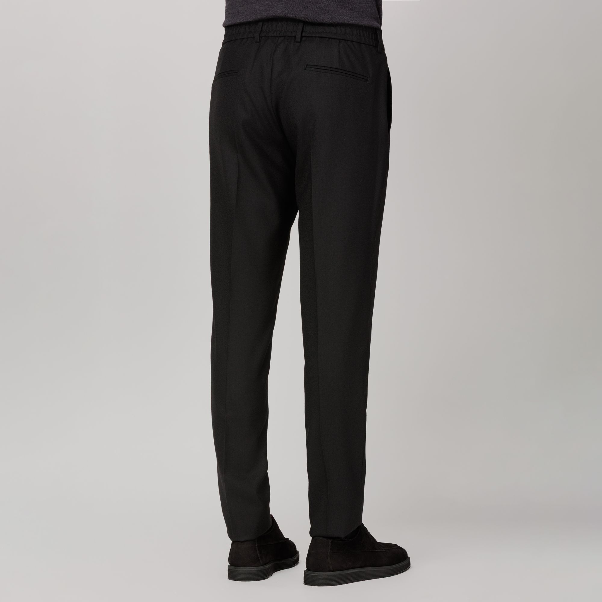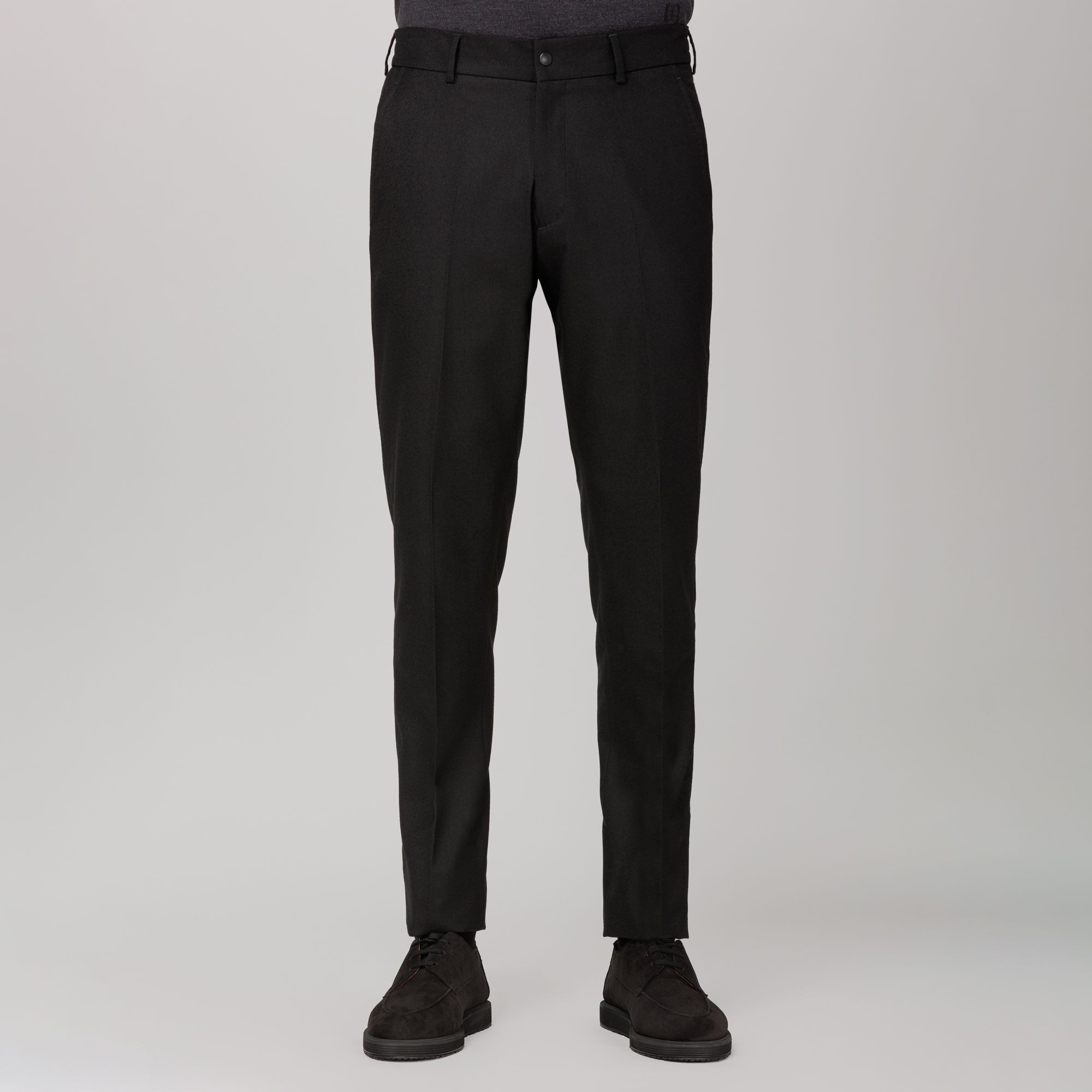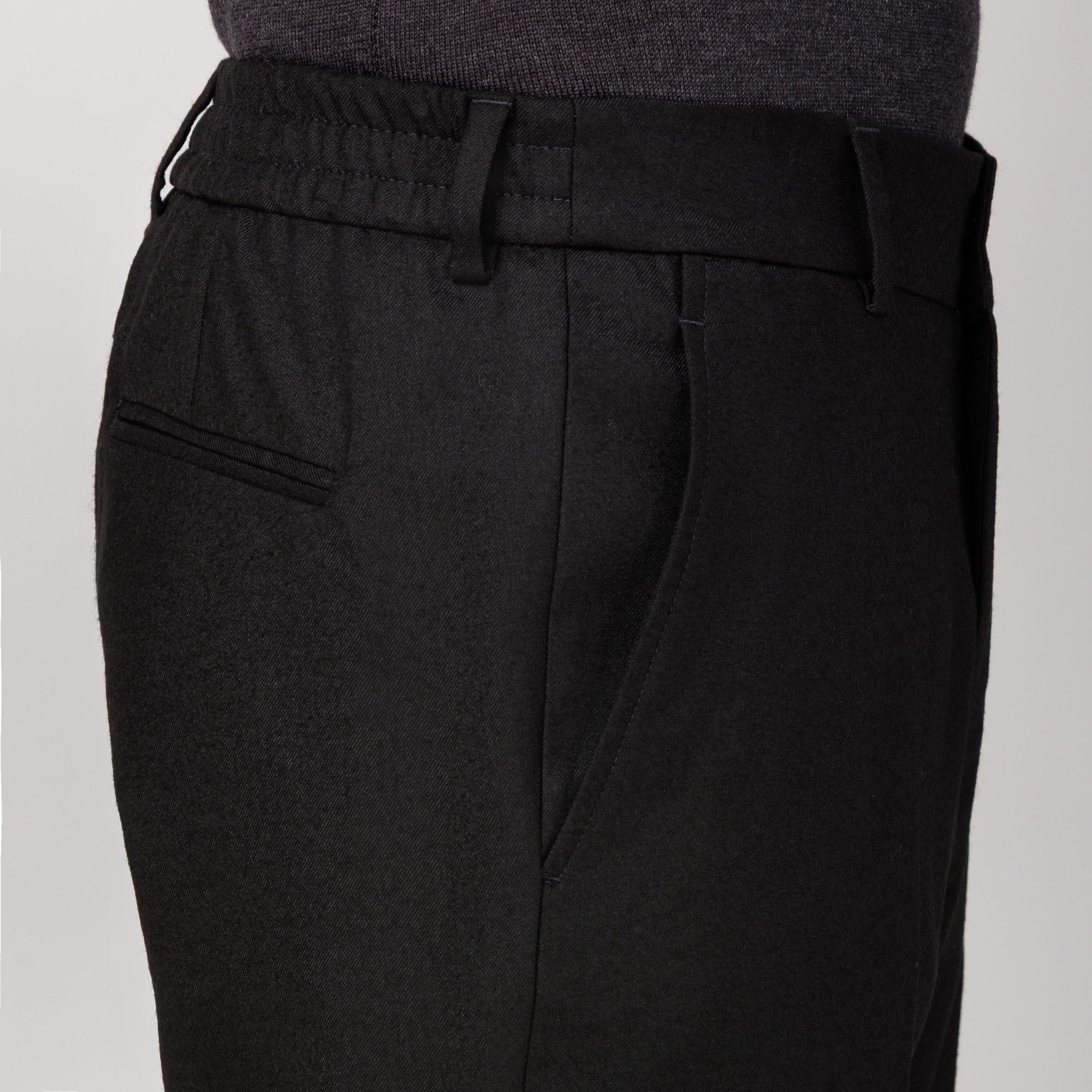 Η διακριτική πολυτέλεια της Elio Evan σε μαύρη φανέλα stretch. Το flat-front κόψιμο και η ελαστική μέση πίσω εξασφαλίζουν άνεση με πειθαρχημένη φόρμα. Κλείσιμο με κουμπί & σούστα, λοξές τσέπες και πίσω πατιλέτες, με σιδερωμένη γραμμή και θηλιές για ζώνη — ιδανικό από business-casual έως off-duty εμφανίσεις. Το ύφασμα easy-care αντιστέκεται στο τσαλάκωμα και χαρίζει ευελιξία. Ύφασμα & κατασκευή Made in Italy.