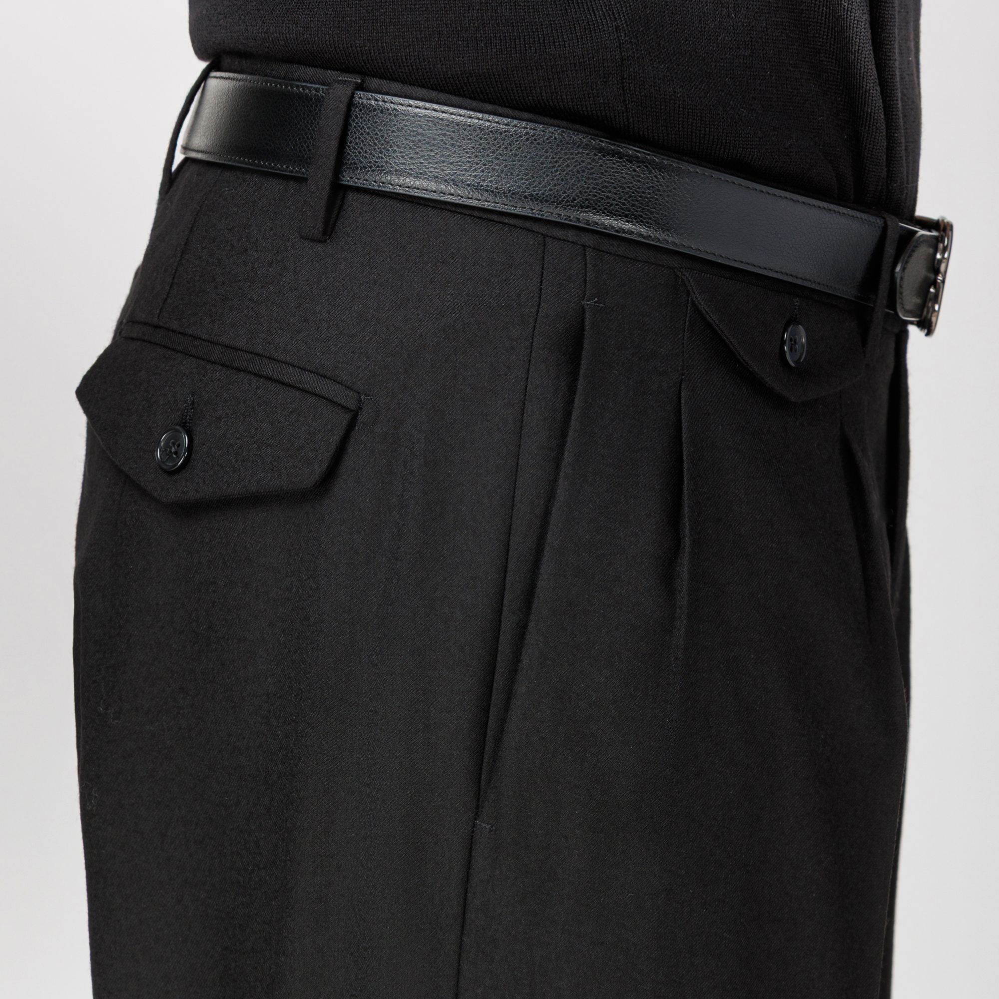Το ανδρικό παντελόνι της Elio Evan σε μαύρο χρώμα είναι κατασκευασμένο στην Ιταλία από πολυτελές wool blend με flannel υφή, συνδυάζοντας κομψότητα και καθημερινή πρακτικότητα. Το μοντέλο Japan ξεχωρίζει με τη κομψή φαρδιά γραμμή, τις δύο πιέτες, τις τσέπες με καπάκι και το ελαφρώς στενό τελείωμα, προσφέροντας άνεση και ισορροπημένη σιλουέτα. Ανθεκτικό στο τσαλάκωμα και πλενόμενο ύφασμα, αυτό το μαύρο παντελόνι ανδρικό αποτελεί ευέλικτη επιλογή που μπορεί να φορεθεί ιδανικά τόσο σε ημι-επίσημες όσο και σε casual εμφανίσεις. Ένα σύγχρονο παντελόνι με πιέτες ανδρικό που συνδυάζει το μοντέρνο με το διαχρονικό με την υπογραφή της Elio Evan.