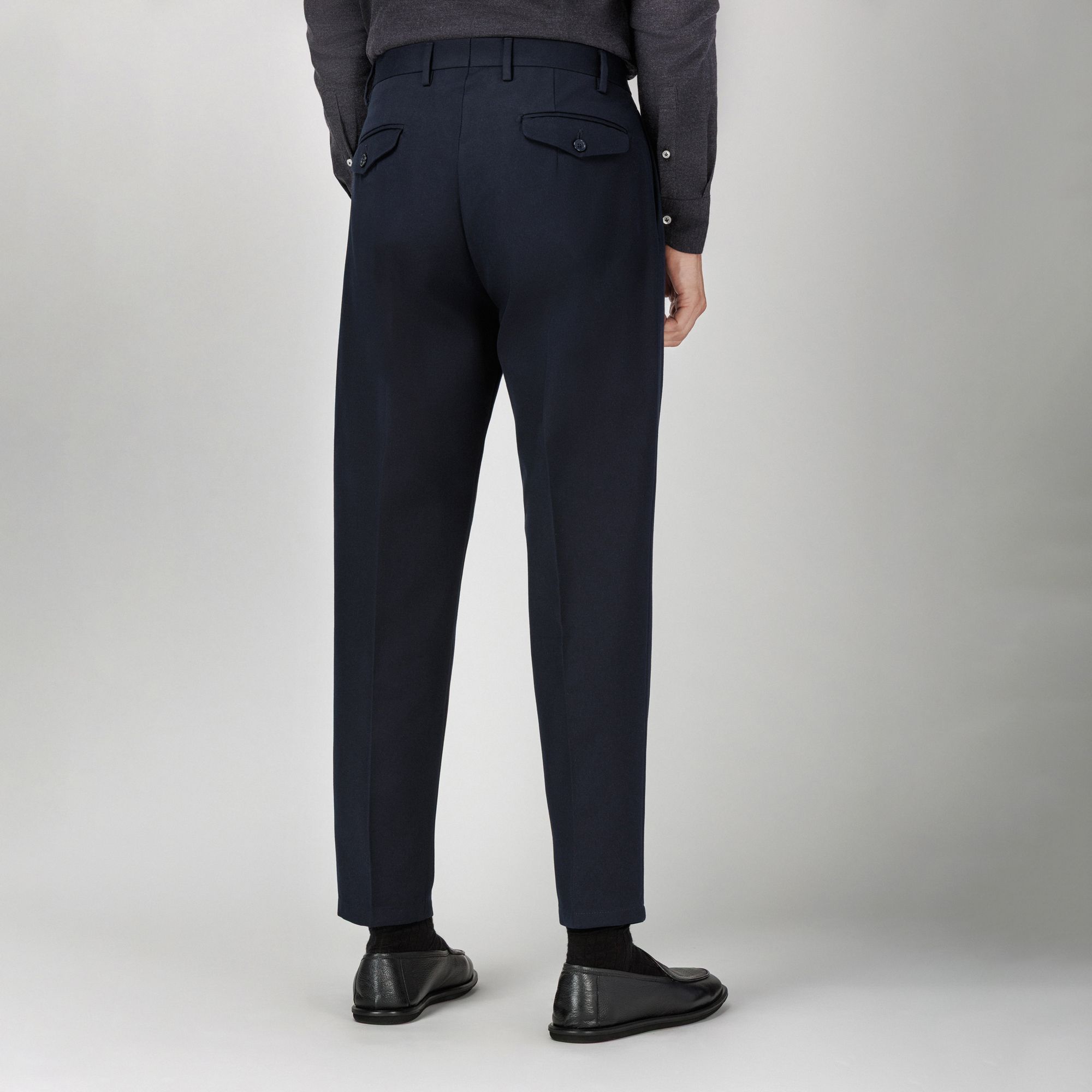 Κατασκευασμένο από εκλεκτό μείγμα παρθένου μαλλιού και Pima βαμβακιού σε twill ύφανση, αυτό το μπλε σκούρο παντελόνι ανδρικό συνδυάζει την ανθεκτικότητα στο τσαλάκωμα με την εξαιρετική διαπνοή και τη κομψότητα. Το μοντέλο Japan ξεχωρίζει για φαρδιά γραμμή με τη διπλή πιέτα και το cropped μήκος του που στενεύει διακριτικά προς τον αστράγαλο, δημιουργώντας μια σύγχρονη και εκλεπτυσμένη σιλουέτα.