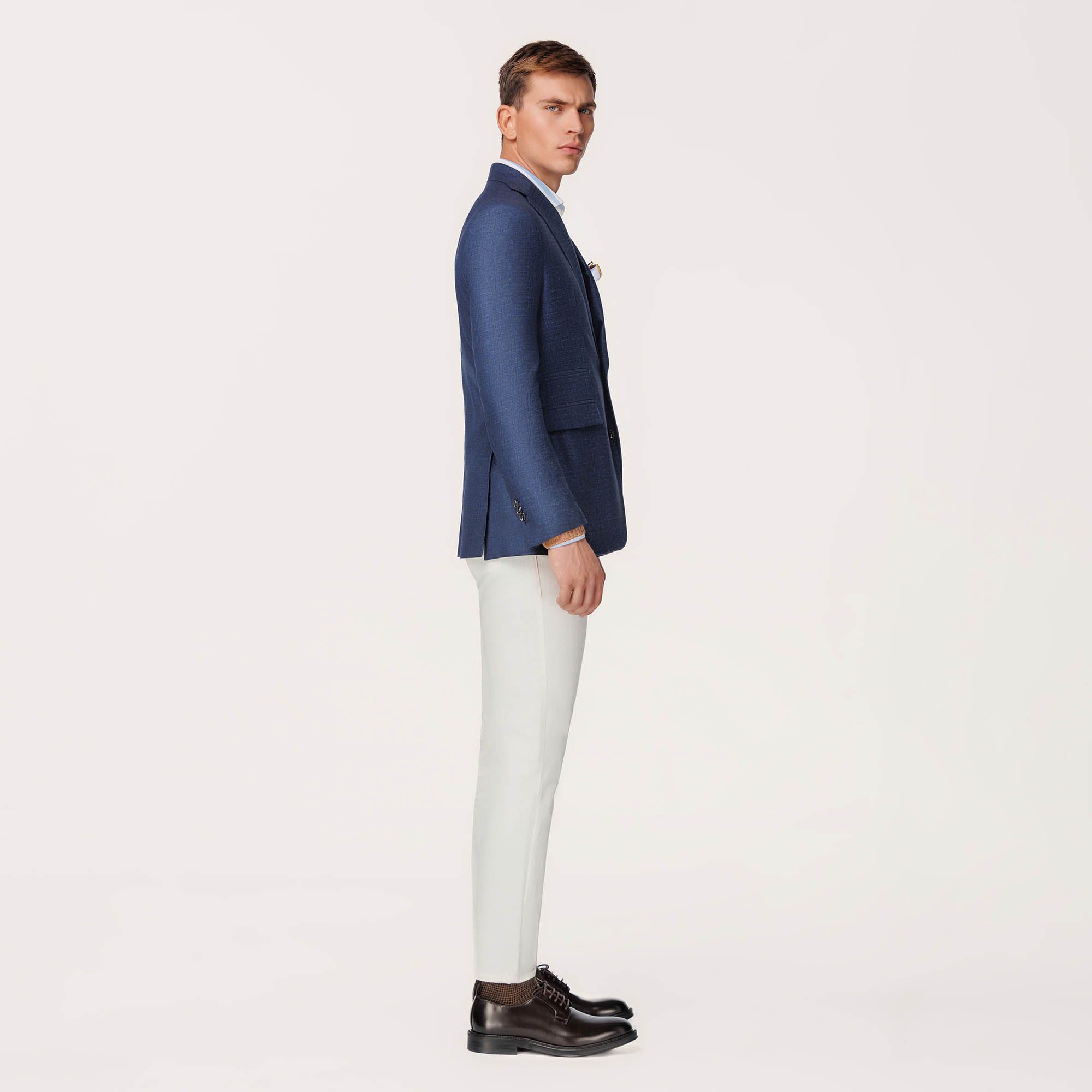 Η νέα συλλογή του Elio Evan γιορτάζει τη μετάβαση του brand, προσφέροντας ρούχα που αντανακλούν την υψηλή ποιότητα και την διαχρονική κομψότητα. Το μπλε blazer είναι φτιαγμένο από ένα πολυτελές μείγμα κασμιριού και μεταξιού με ιδιαίτερη slub υφή, που προσδίδει μοναδικό χαρακτήρα και εκλεπτυσμένο φινίρισμα.