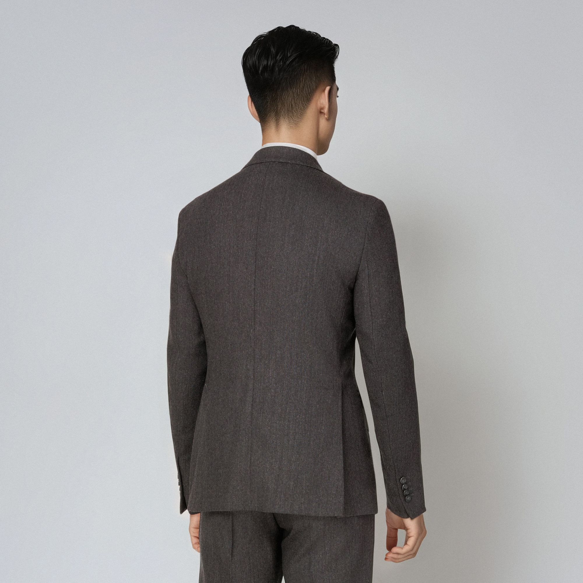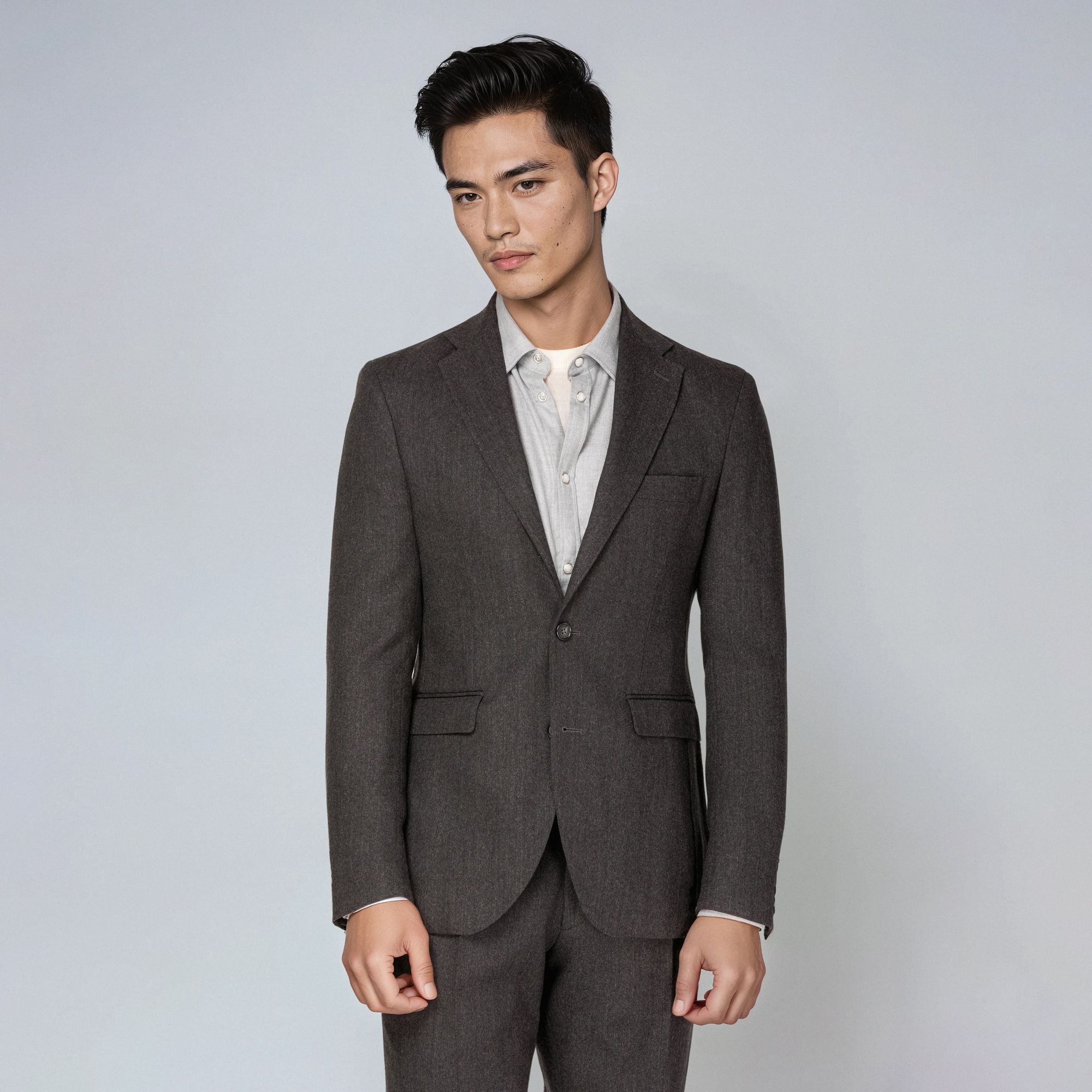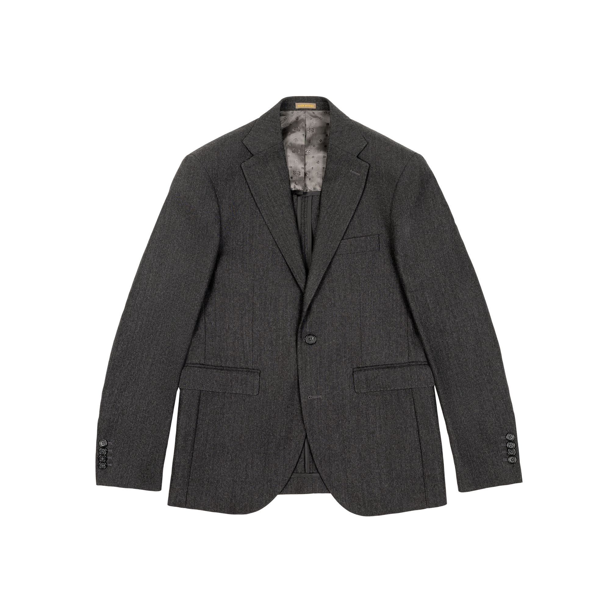 Ένα ανδρικό σακάκι υψηλής ραπτικής σε μάλλινο crepe ύφασμα, σε γκρι ανθρακί απόχρωση με ελαφρώς βουρτσισμένη υφή που χαρίζει πολυτέλεια και βάθος.
